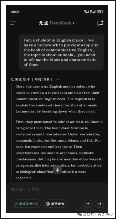 围绕《新交际英语综合教程》“Animals”单元,张老师让学生先集体讨论预习要点,再借助DeepSeek深度预习并记录互动过程。成果展示时,学生汇报思路,老师引导分析差异。