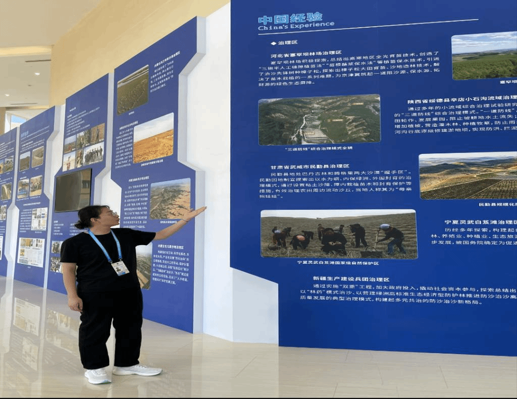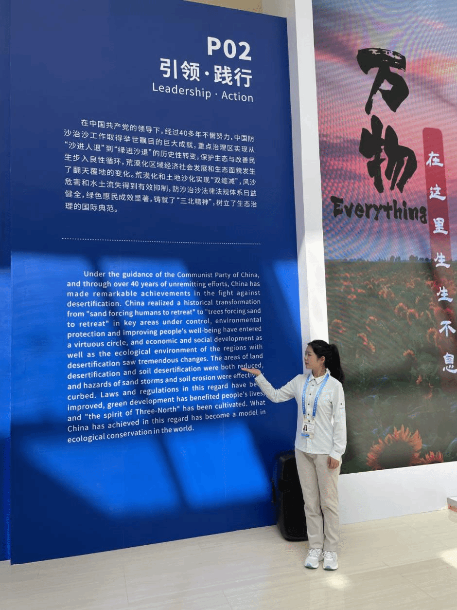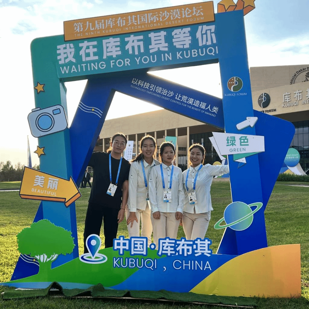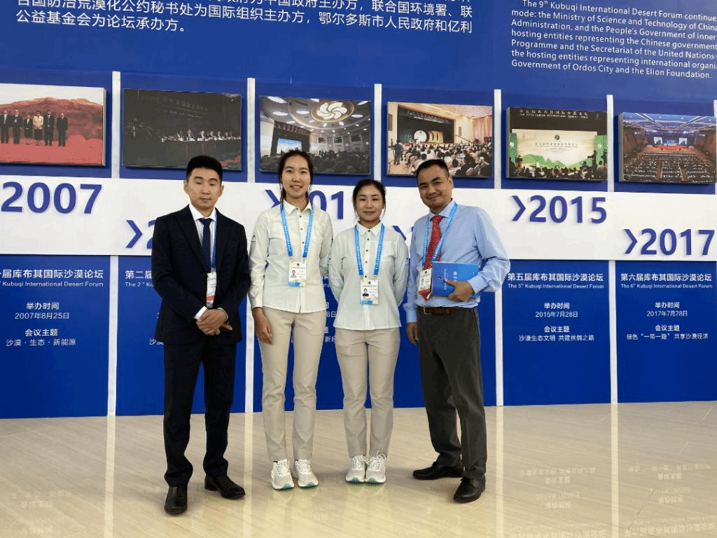 2022级英语口译专业萨日盖、斯日吉莫德格、黄零鑫、史芬四名同学按照大会组委会的安排全程参与了大会翻译志愿服务,先后承担了随车讲解、展板讲解、会务志愿服务等多项工作。同学们细致周到的服务、饱满的精神状态、良好的口笔译素养给组委会和参会嘉宾留下了深刻印象。短短五天的工作,同学们深刻体验了防沙治沙的实践成果,更将他们的青春热情注入到中国的国际交流中。