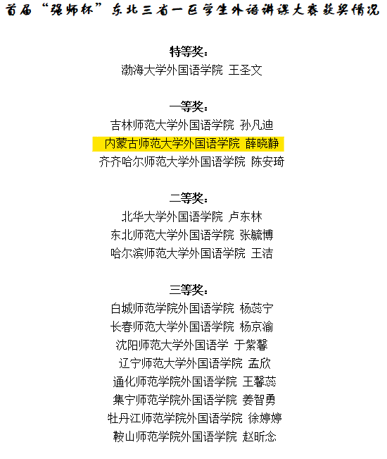 会议期间,评委会对首届“强师杯”东北三省一区学生外语讲课大赛的参赛作品进行评选,本次大赛共19所学校派选手参加。经过评审,最终评选出特等奖一名、一等奖三名、二等奖三名、三等奖八名。由taptap点点呼和塔拉老师指导的薛晓静同学凭借教学设计、课件制作和模拟授课等环节的突出表现,最终在大赛中脱颖而出,荣获一等奖。