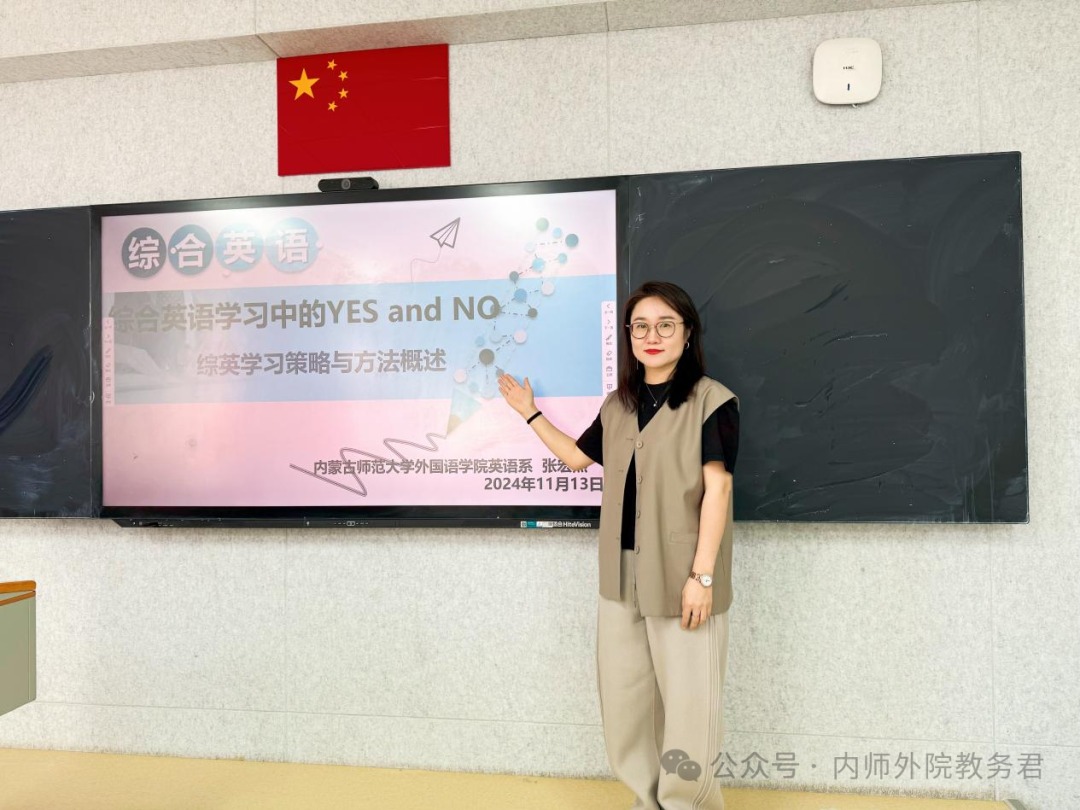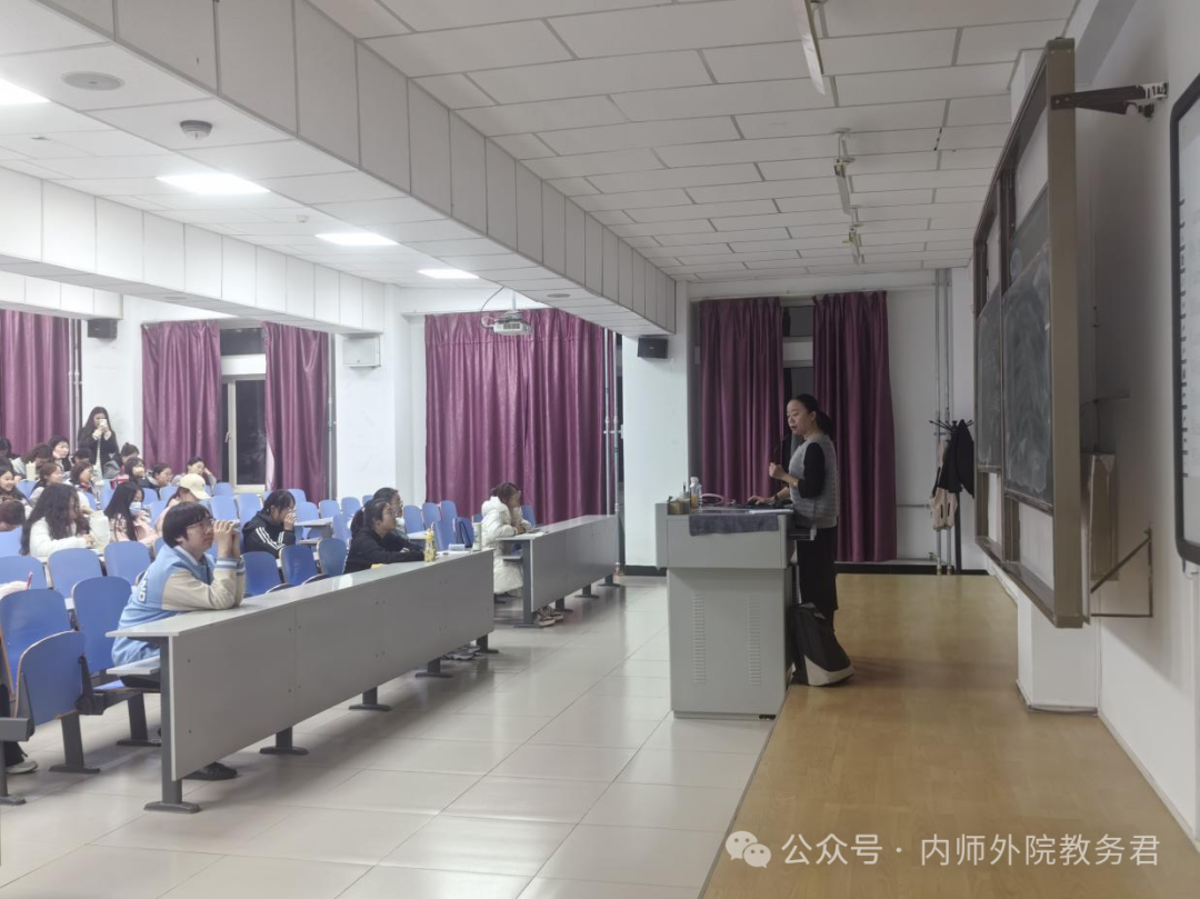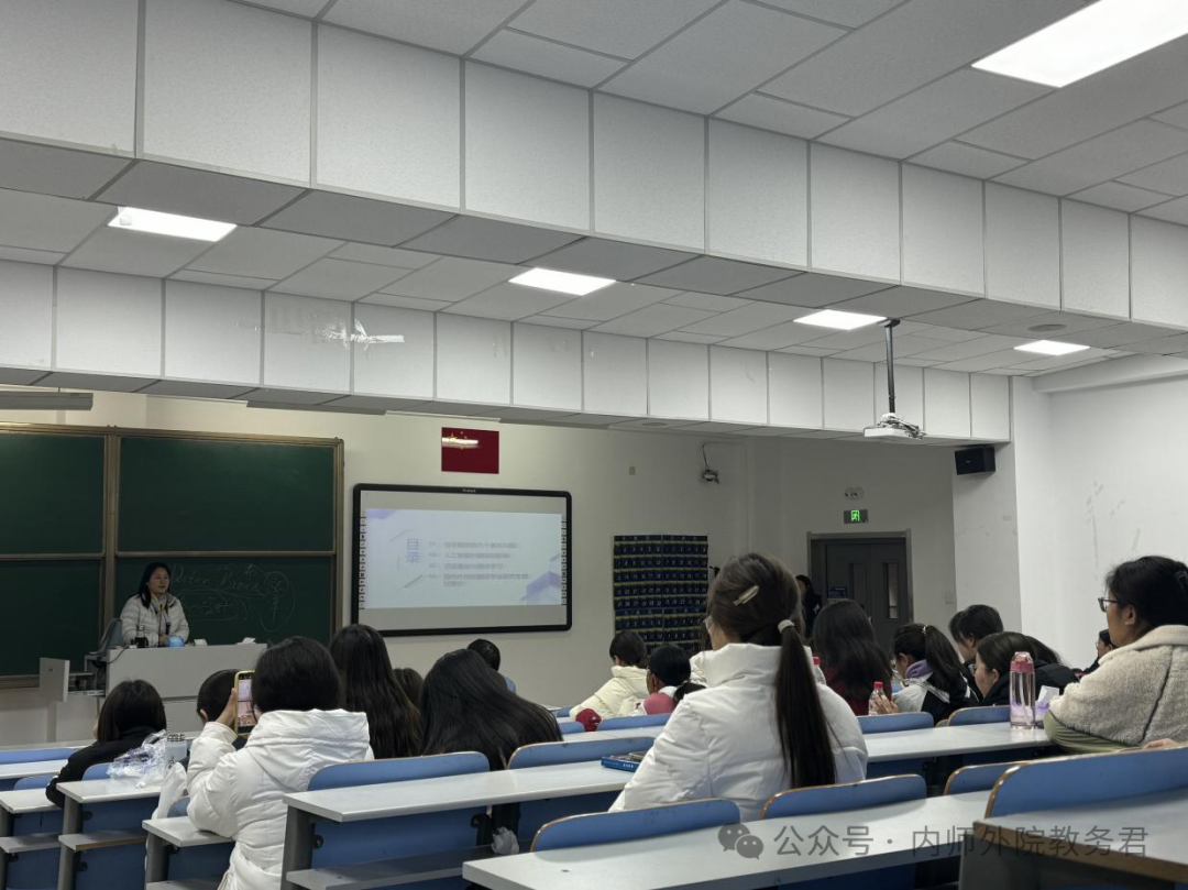 在首场讲座中,呼和塔拉老师以 “为师之道——英语师范生教学技能养成”为题,深入阐述了优秀英语教师应具备的专业素养。她重点强调了教师教育的核心要素,包括发音规范、板书技巧和教学设计等专业技能。通过邀请教师技能大赛获奖者分享经验,进一步展示了各类教学竞赛对提升教学能力的重要作用。呼和塔拉教授勉励同学们要心怀教育理想,持续提升自我。