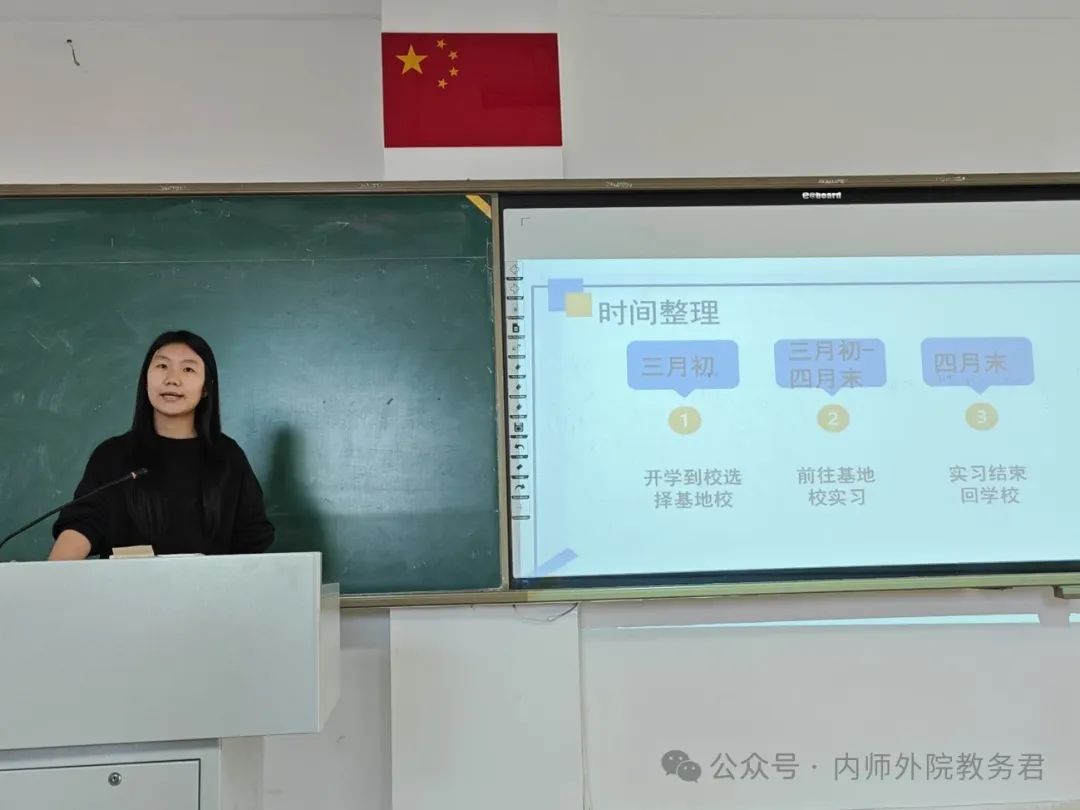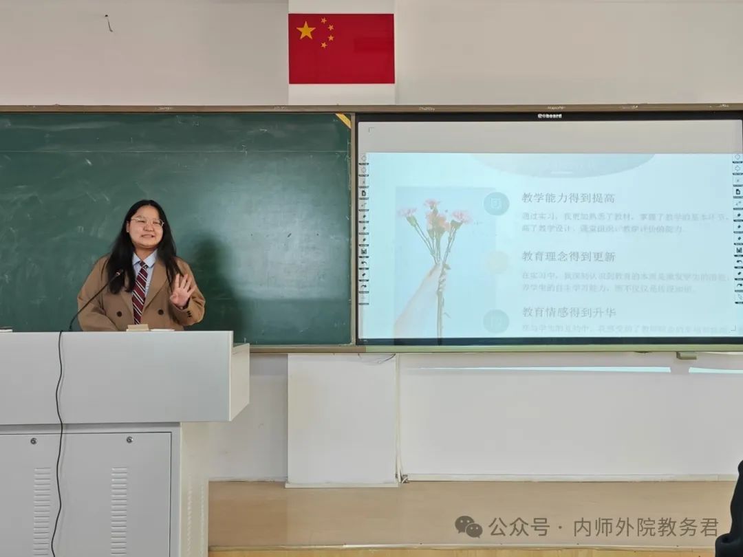 塔娜作为校内指导老师代表从专业实习和班主任实习两方面点评了2021级日语专业学生实习情况,充分肯定了实习生的教学能力、专业知识和班主任工作方法,强调了教育实习能够增强交流沟通能力这一意义,并且寄语同学们继续努力,让实习经历成为今后人生道路上的宝贵财富。