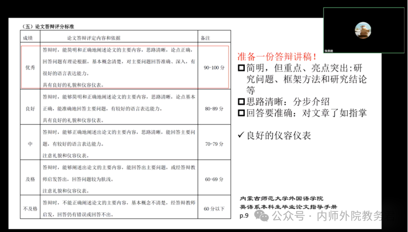 为确保本次毕业论文答辩工作的顺利开展,英语系对各环节进行了周密部署。从论文选题到中期检查,再到后期的论文查重,步步追踪,监督每一位本科学生保质保量地按时完成论文撰写。在论文答辩前,发布《英语系2024届本科生毕业论文答辩分组安排表》、《英语系2024届本科生毕业论文答辩方案》等重要通知,帮助答辩教师和同学提前熟悉答辩流程,以保证答辩工作顺利开展。此外,为提高学生对毕业论文答辩重要性的认识、帮助学生了解答辩流程,于5月9日召开“2024届英语系本科生毕业论文答辩前说明会”。会上,英语系副主任张贵超老师认真梳理答辩要求和具体流程、明确注意事项、分享答辩技巧、回答学生提问。随后,又召开答辩秘书培训会,明确答辩工作流程和内容,叮嘱答辩细节。