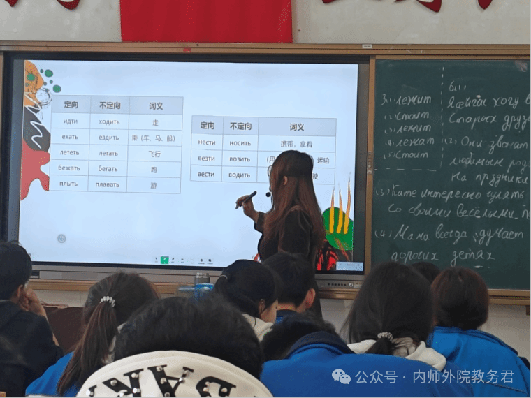 六位同学本周实习的重点是学习毕远芳老师俄语语法课的教学方法。为了调动学生的学习热情,毕老师将知识点融入游戏当中,通过模拟城市交通情景,让学生扮演地铁调度员、乘客等角色,在真实语境中还原运动动词的用法。实习生甘雨阳在笔记中写道:“老师模拟地铁调度员和乘客之间的对话场景开展教学,抽象的语法概念变得生动有趣。”