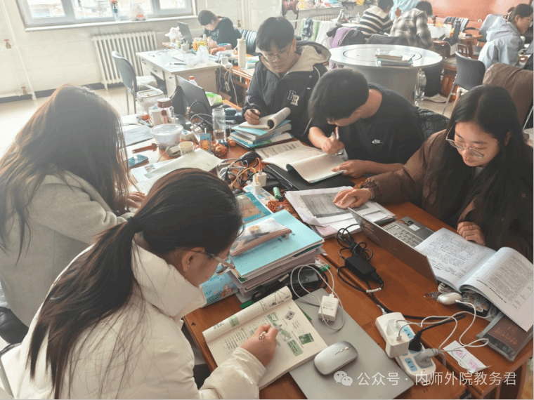 陈建博、王佳敏、李赵微、王欣冉、张睦晗、甘雨阳等六位同学自发开展协同备课,共同讨论俄语教学的好办法。每周二、三、四晚,同学们聚在一起总结一天的收获,分享各自遇到的教学难题。甘雨阳提到,锦山二中的俄语教师们自主编写了一套俄语语法学案,整合了高中俄语语法全部知识点,为高三学生构建了清晰的语法知识框架,真正实现了“学得透、教得活”。