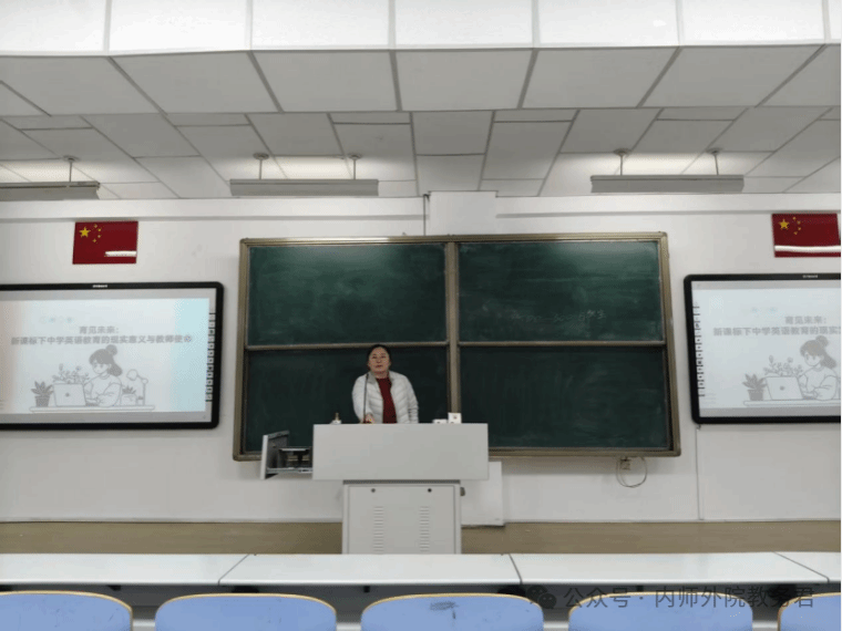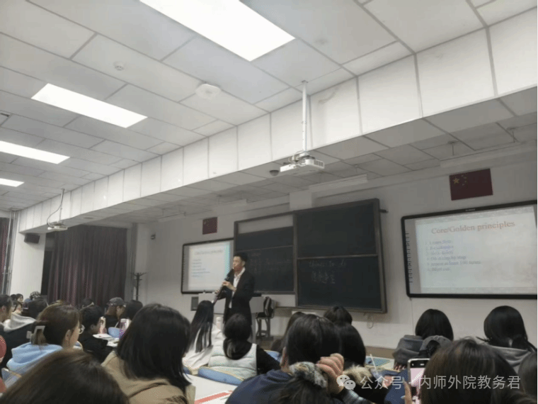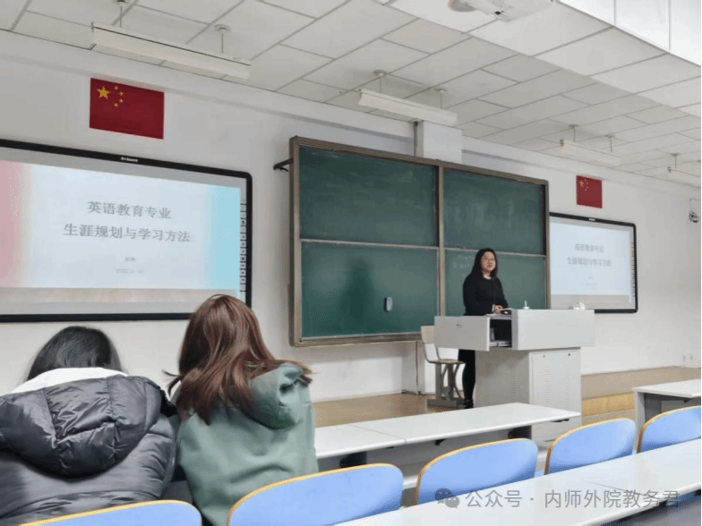 第四场讲座,呼和塔拉老师以“为师之道——英语专业师范生专业发展”为题,结合维果茨基认知理论和皮亚杰发展规律,深入剖析了英语专业师范生在不同学习阶段的特点与需求。此外,特别邀请了两位在英语学习和师范技能比赛中表现出色的学姐,分享宝贵的学习经验以及参与竞赛的精彩历程的心得体会,详细解答了新生们关于如何在各种场合,比如课堂展示、学术竞赛以及求职面试中,有效地吸引评委和听众的注意力等实际问题。呼和塔拉老师最后强调,优秀教师不仅要善于讲解,更要善于启发。